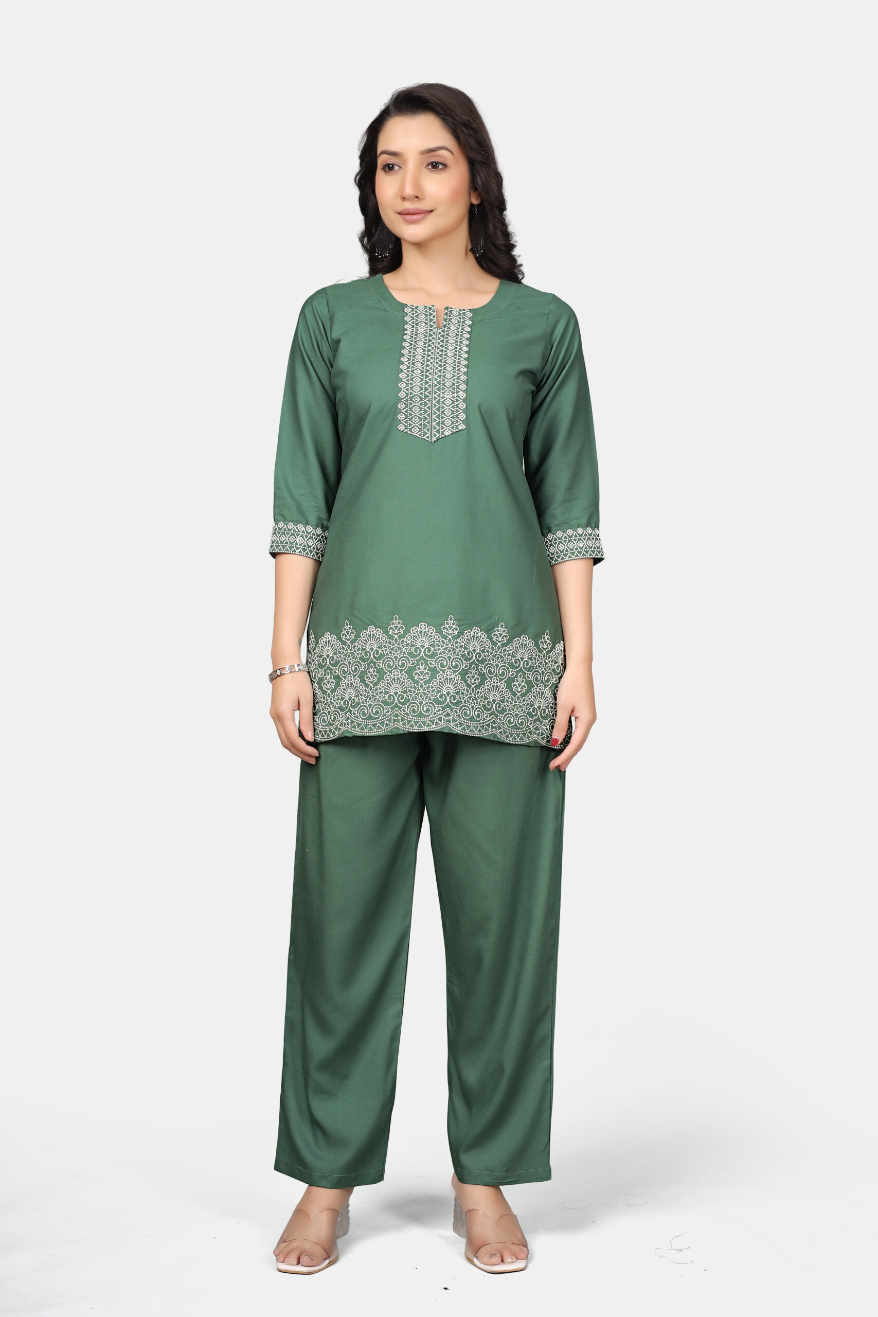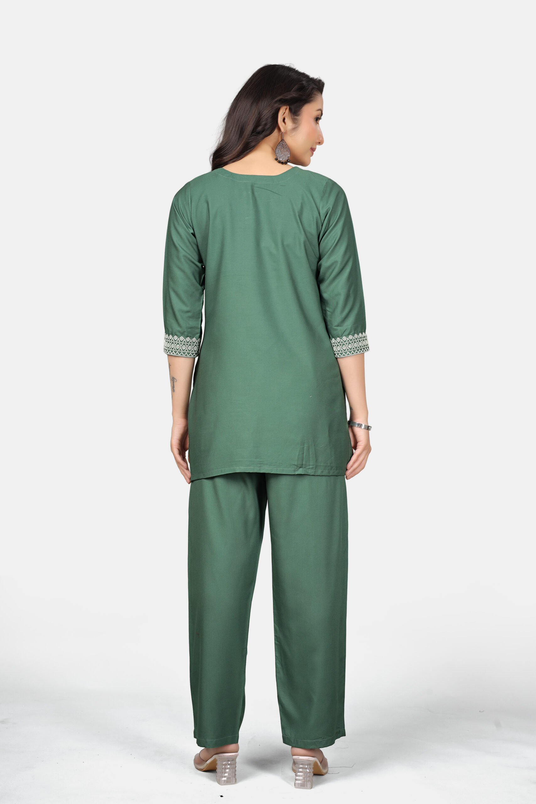 Crafted from premium heavy rayon, this set offers a smooth, flowy drape while maintaining a structured appearance. It feels soft on the skin, falls beautifully on the body, and stays comfortable through long hours. The dark pista tone brings a fresh yet grounded feel, making it an ideal repeat-wear piece for work and daily styling.
