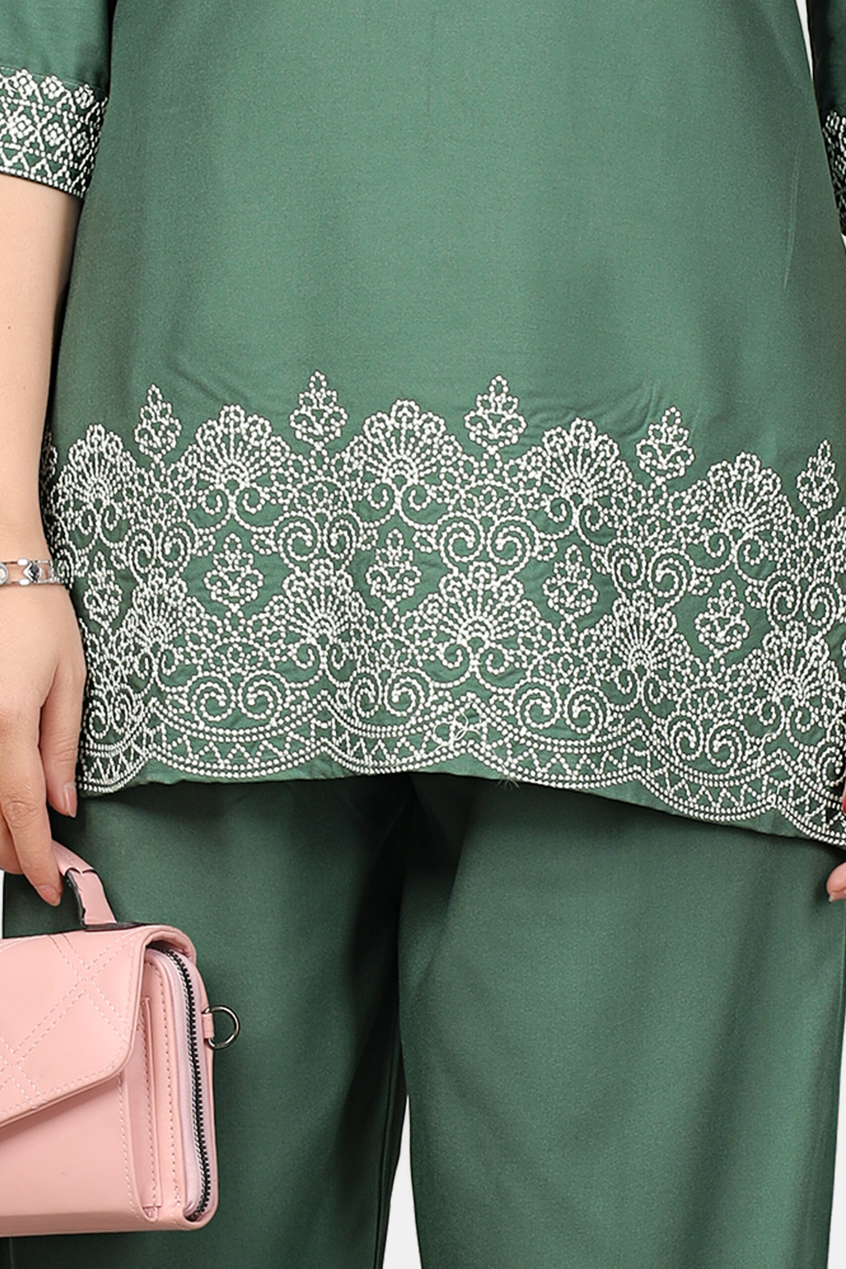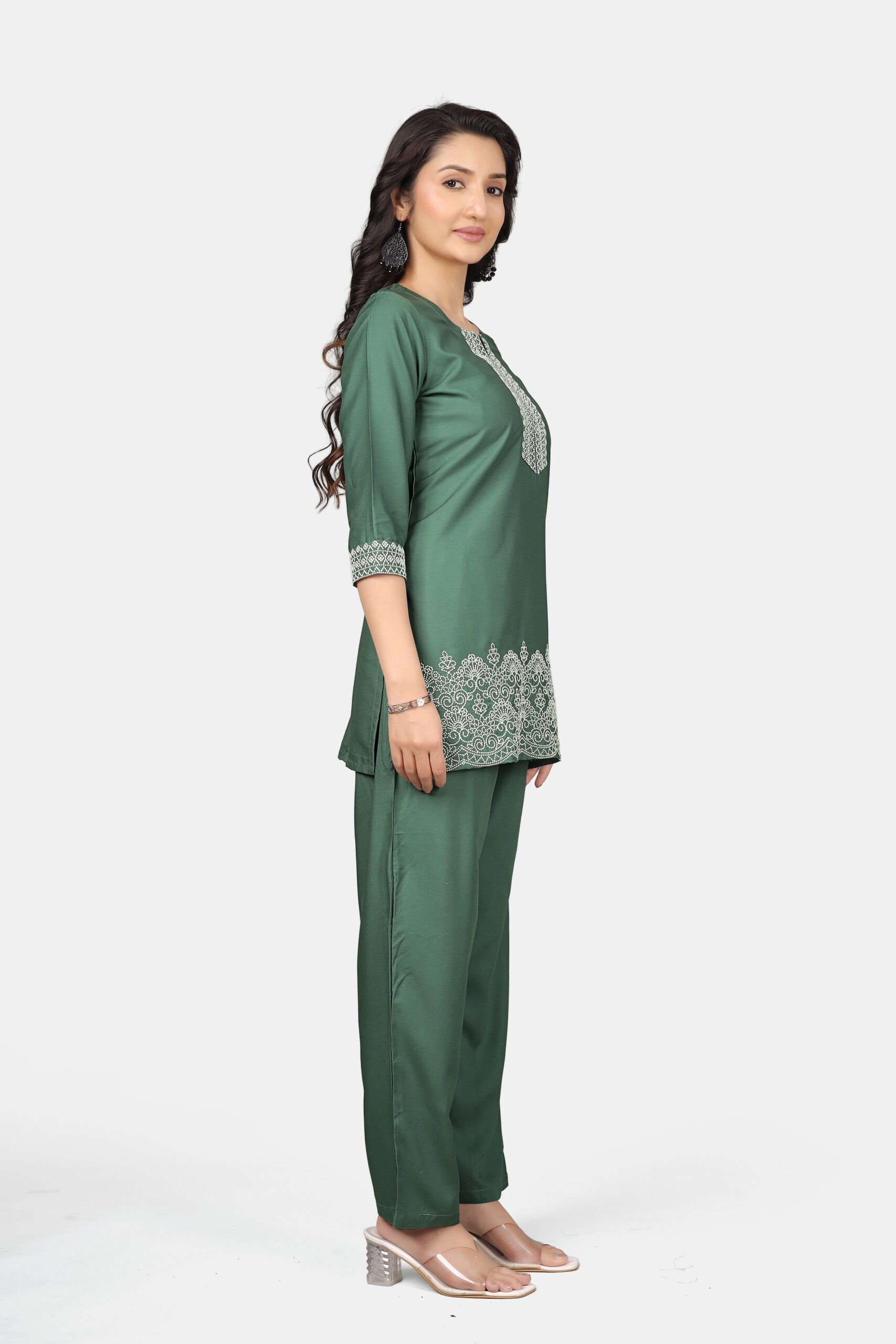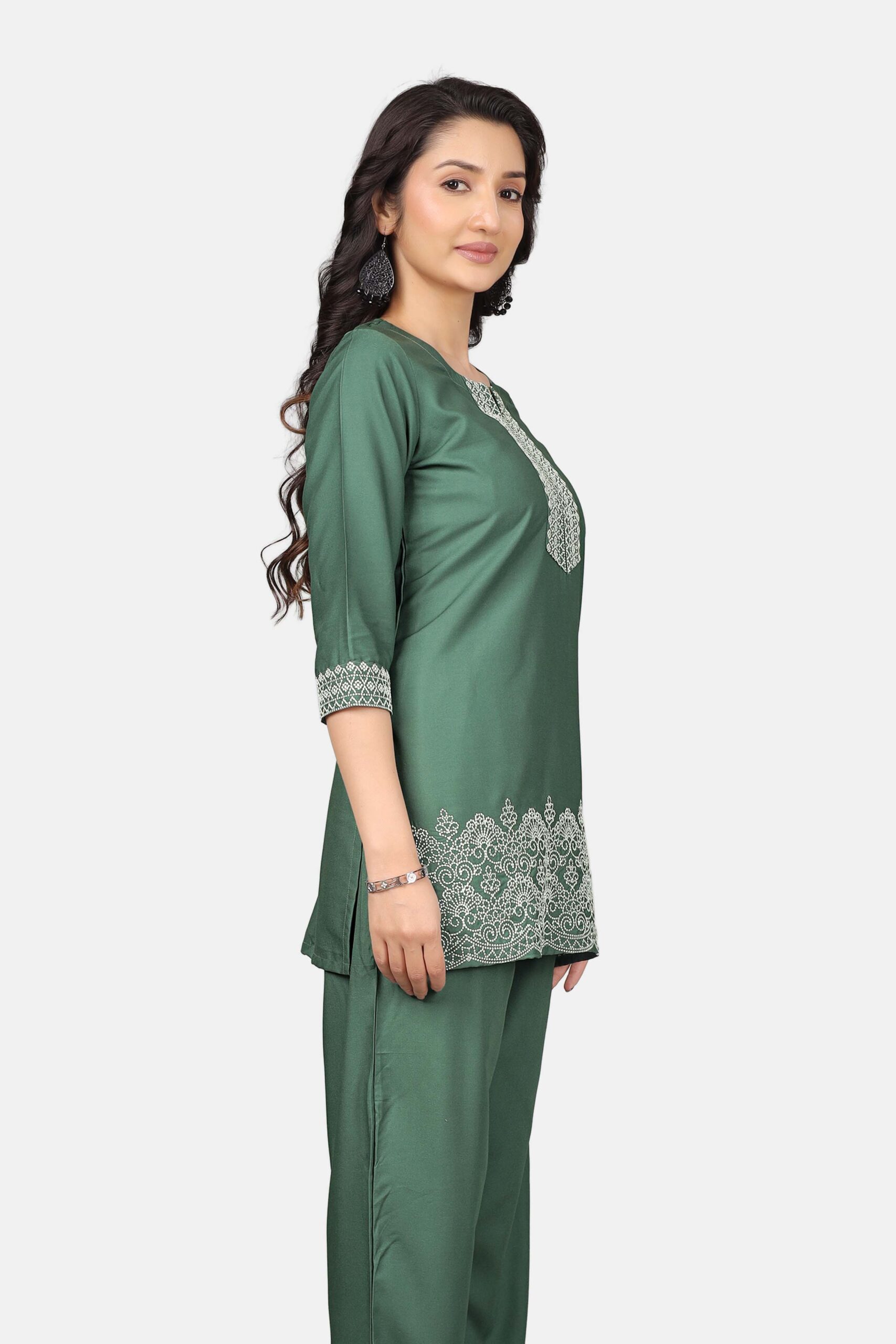 Refined, minimal, and quietly powerful. This dark pista green co-ord set by Doviba is designed for women who prefer elegance without excess. With its clean structure and delicate embroidery, it delivers a polished look that feels effortless from morning to evening.
