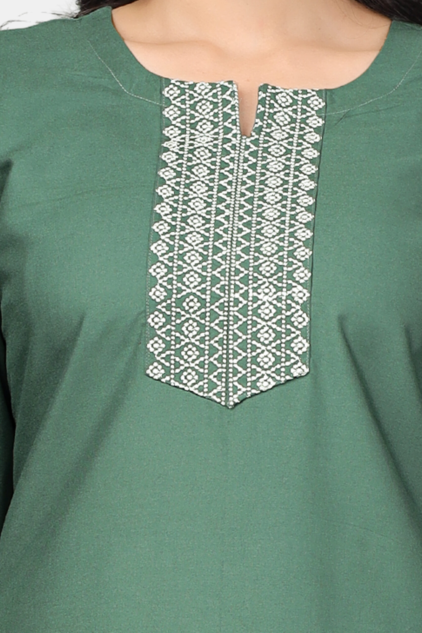 The kurti features a soft notch neckline with intricate embroidery on the front panel and hem, adding subtle detail without overwhelming the design. Paired with straight-fit trousers, the silhouette remains sharp, balanced, and perfect for everyday sophistication.
