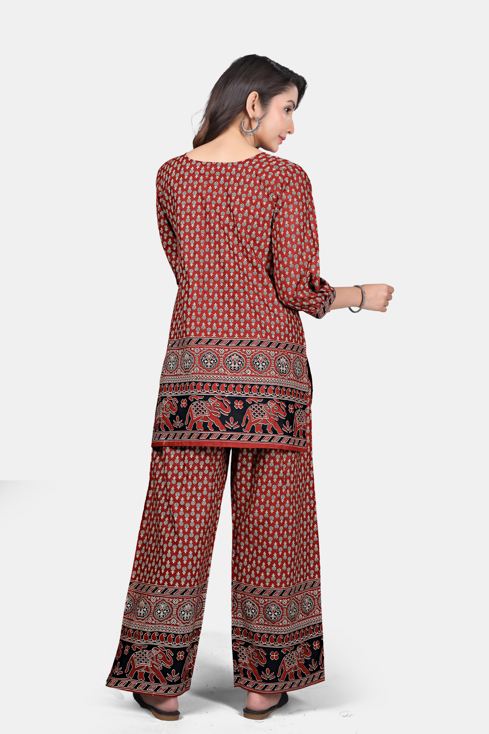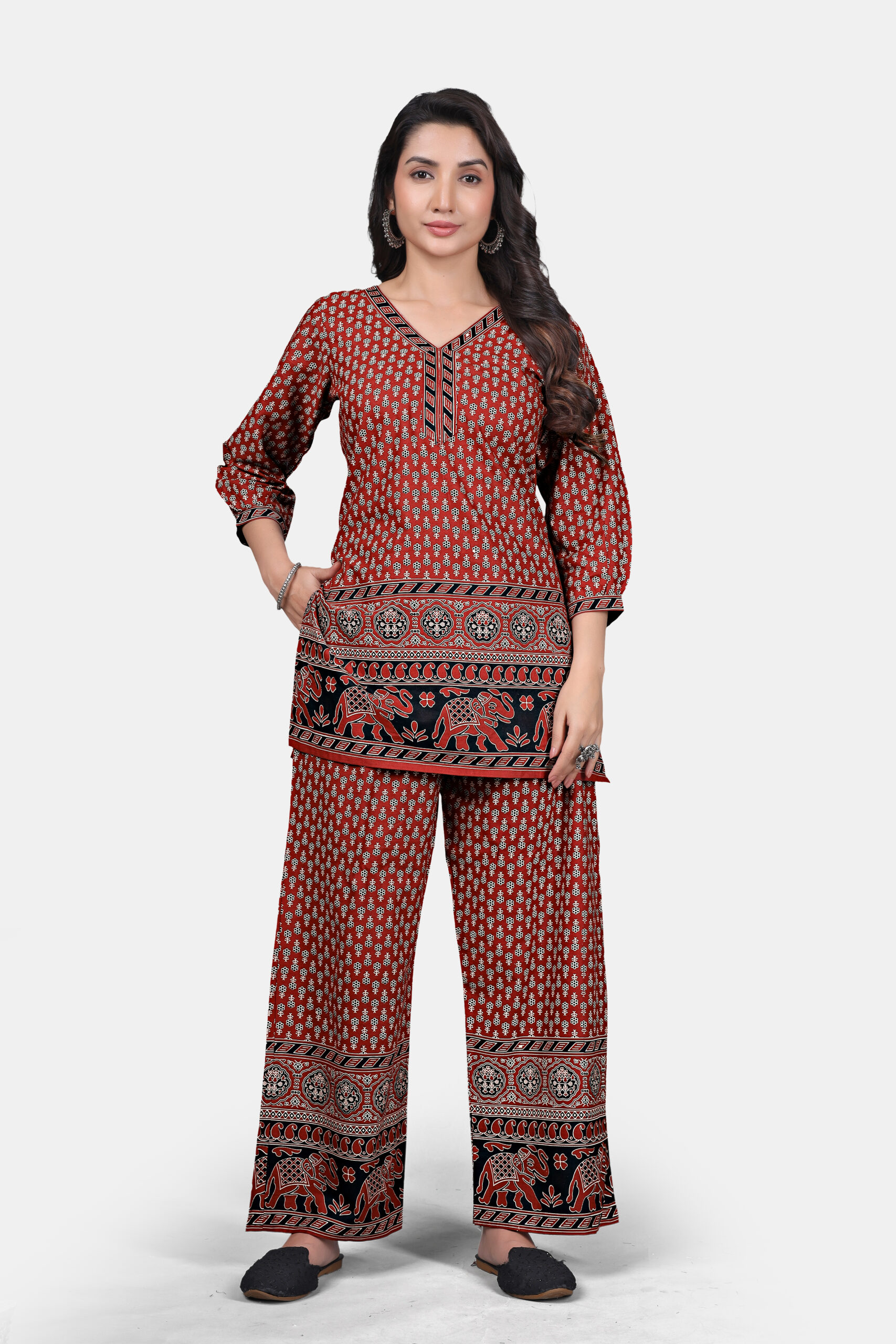 Built for everyday ease with a touch of tradition. This rust ethnic co-ord set by Doviba delivers a complete, effortless look that feels both grounded and refined. Designed for women who value comfort without compromising on presence, it brings together heritage-inspired prints with a clean, wearable silhouette.