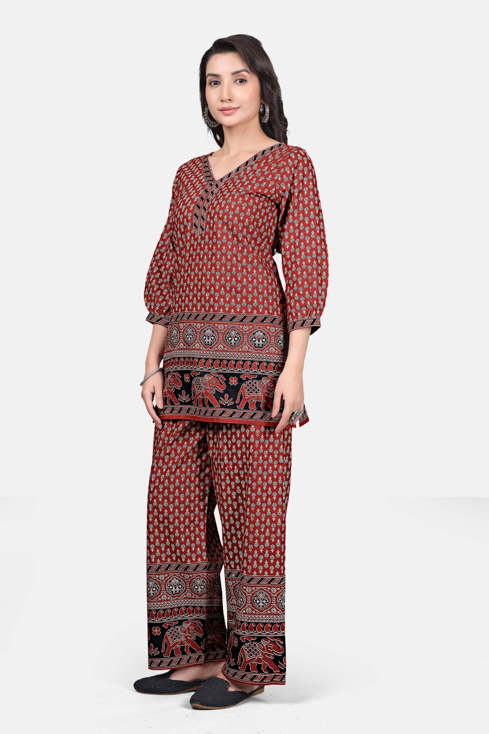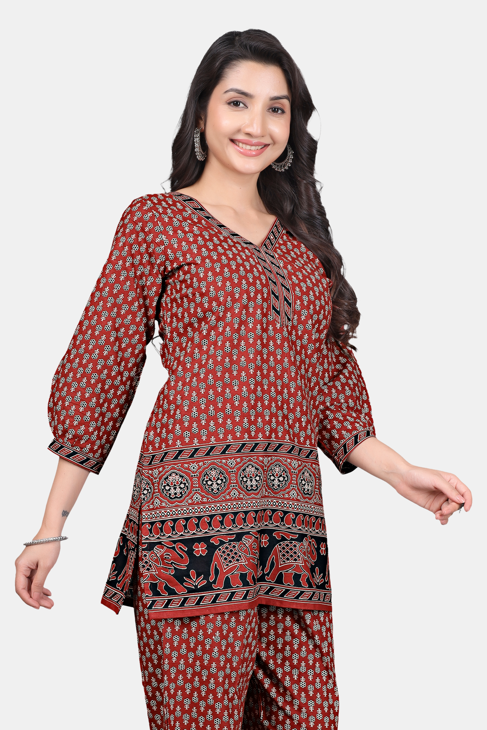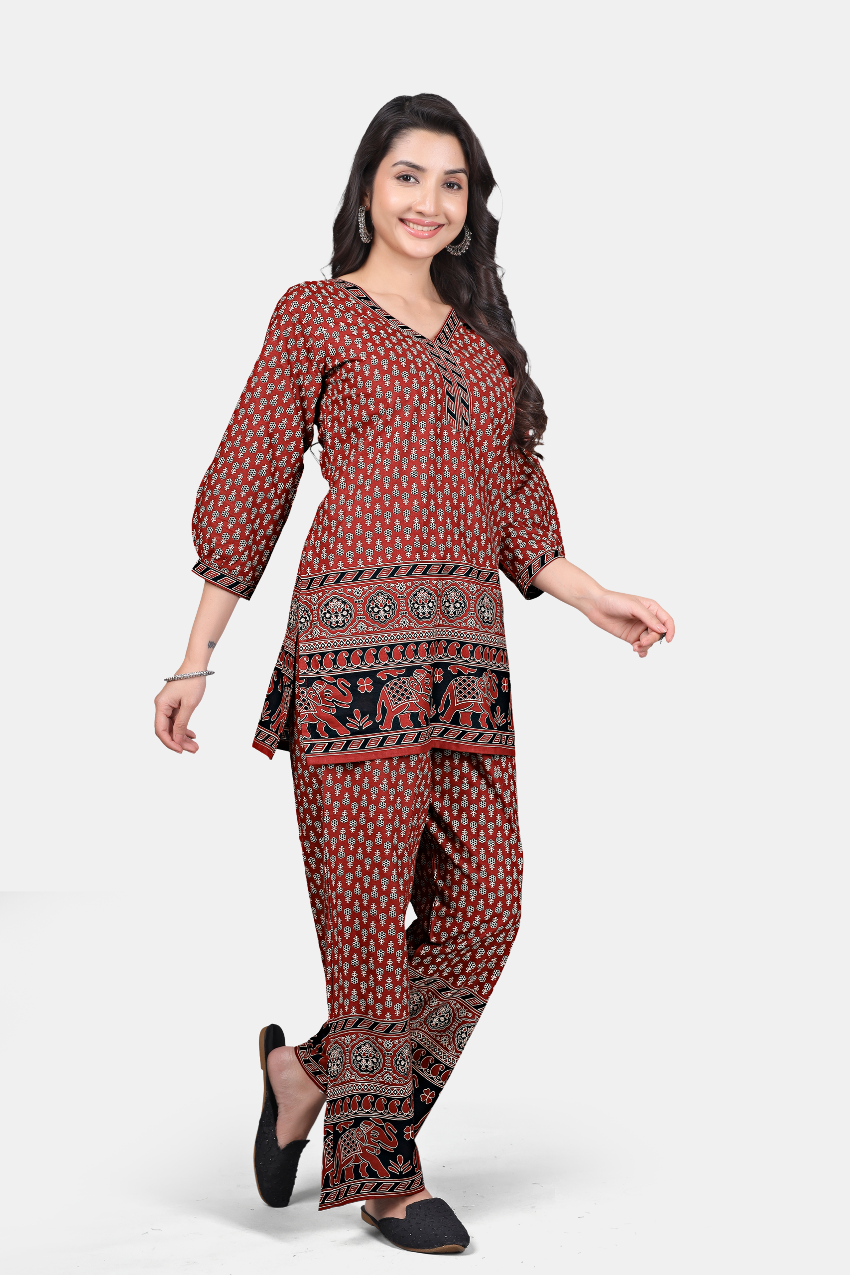 Crafted from breathable pure cotton, this set keeps you cool and comfortable through long hours, making it ideal for daily wear, work settings, and relaxed outings. The rich rust tone with traditional motifs ensures timeless repeat wear.